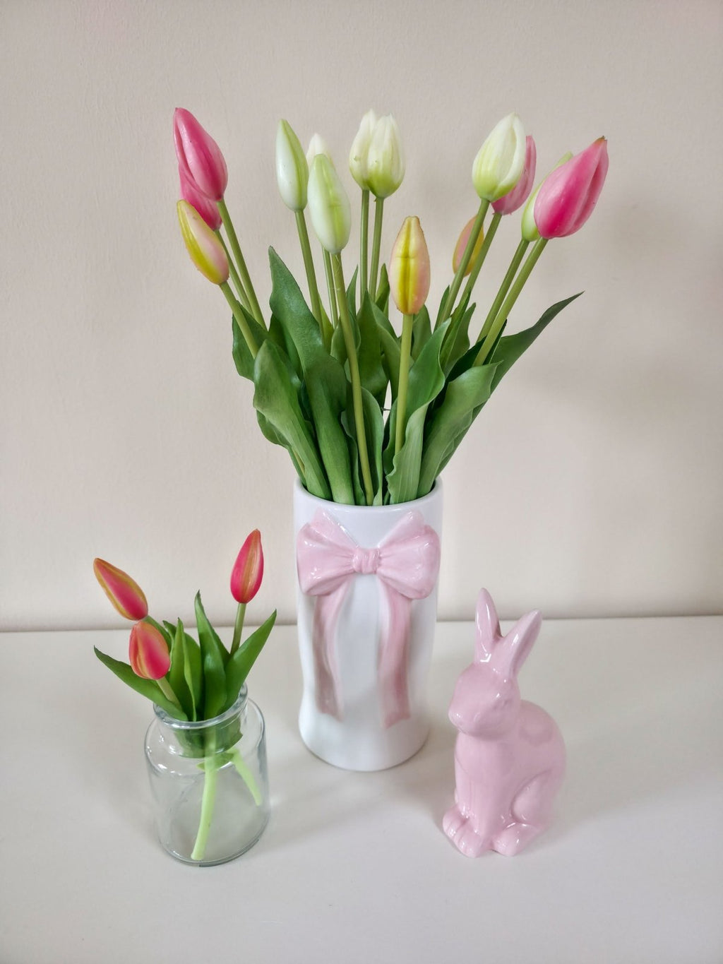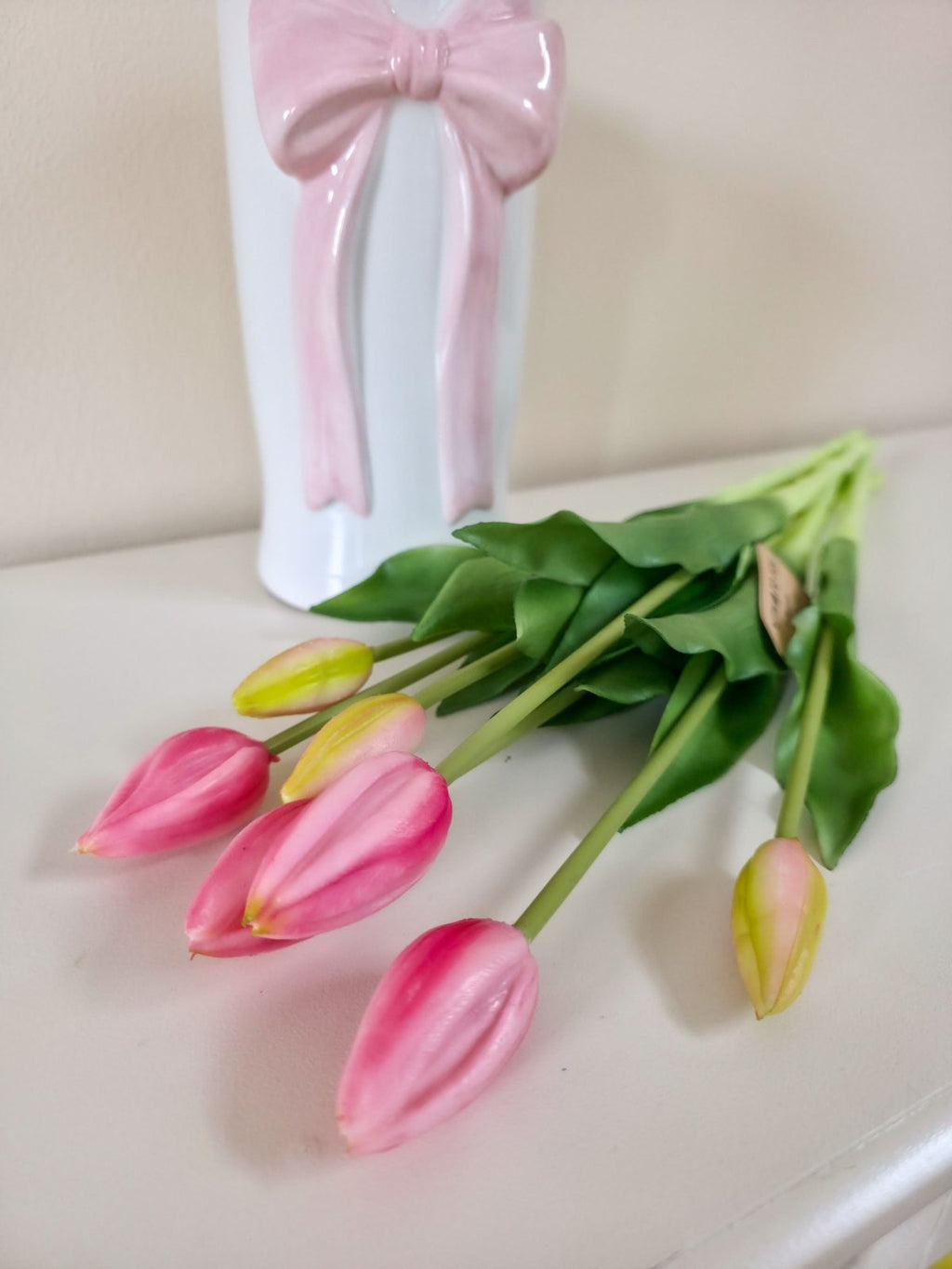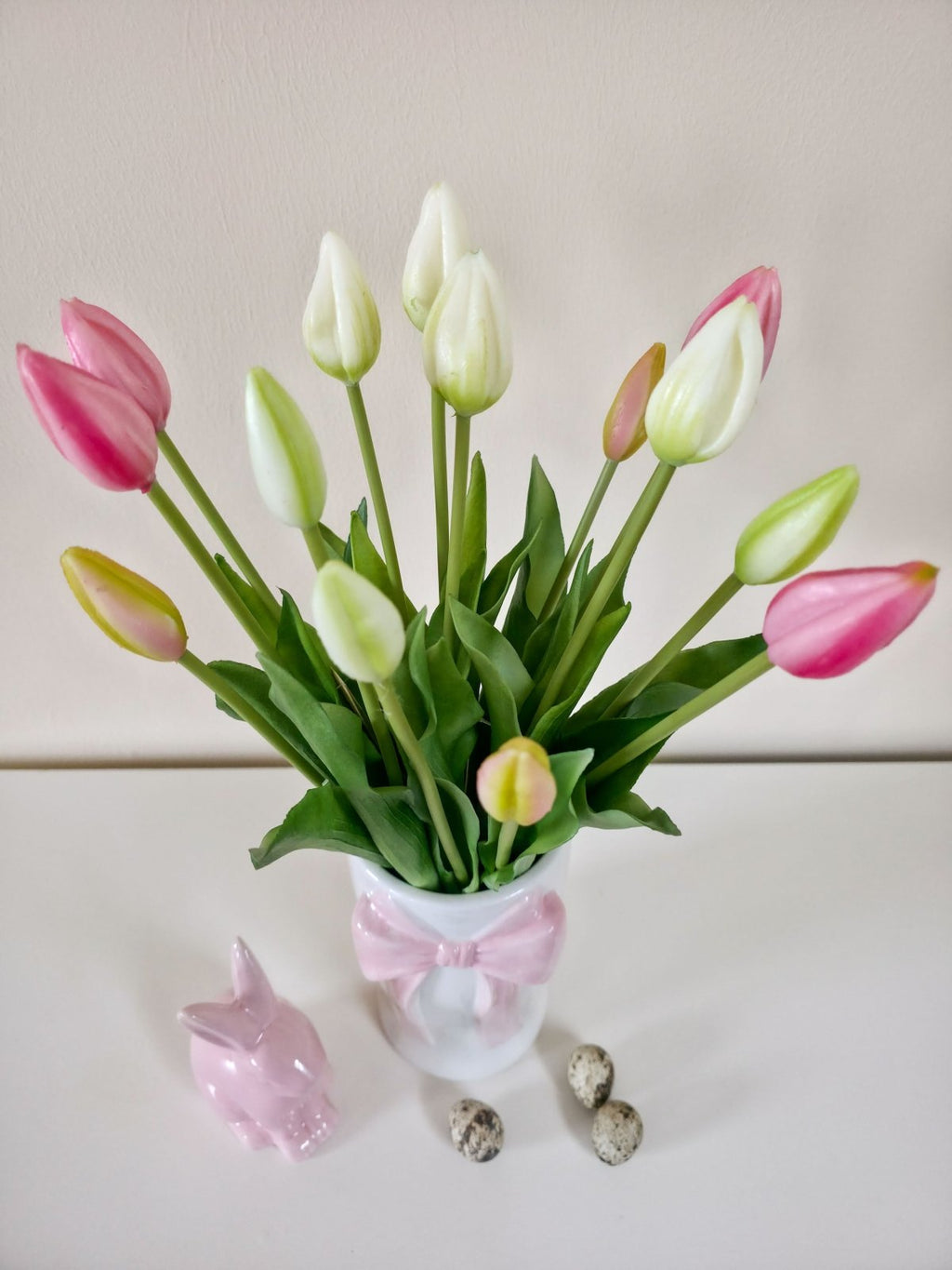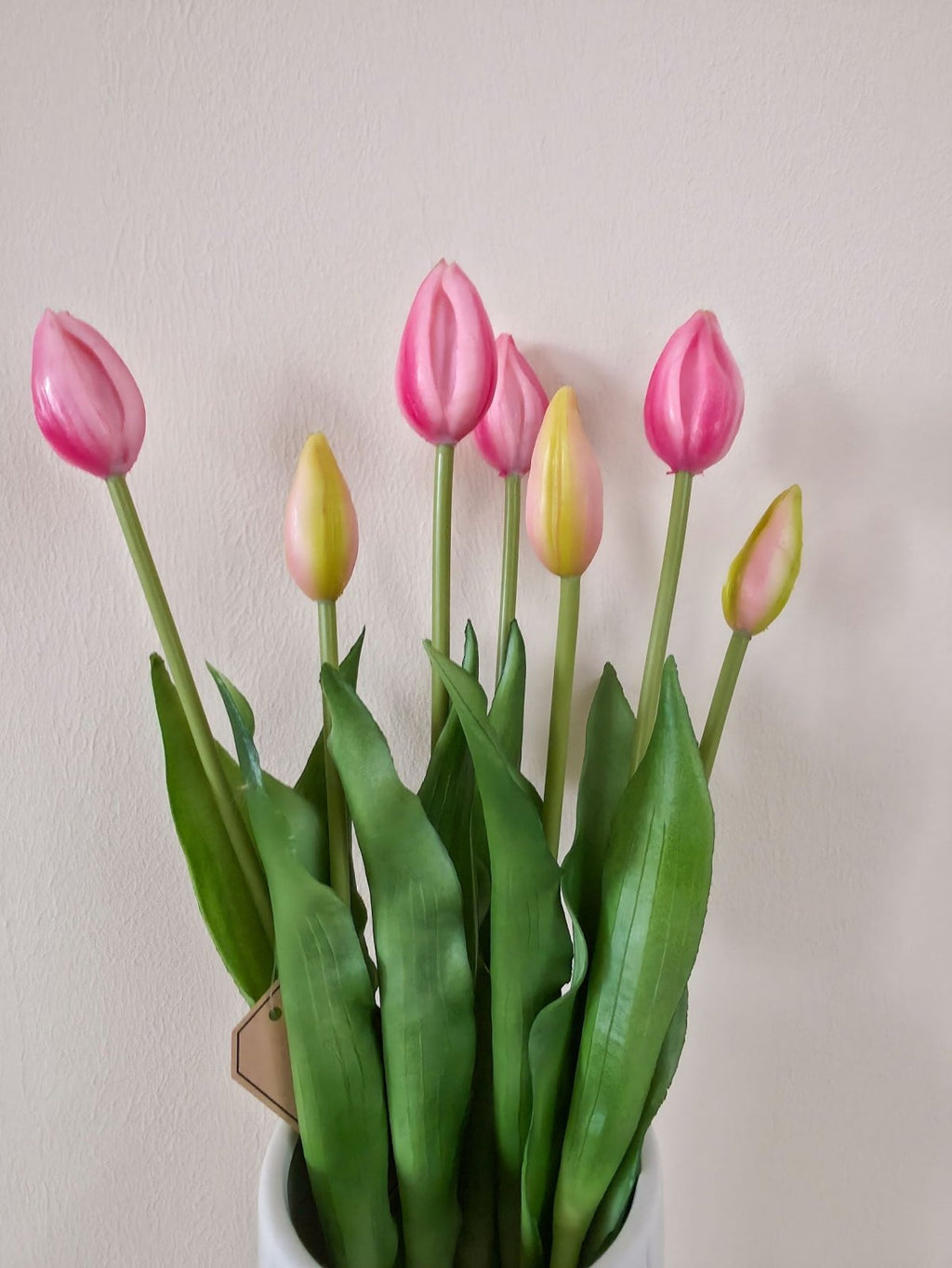 Dieser hochwertige künstliche Tulpenstrauß mit 7 Tulpen überzeugt durch seine realistische Optik in zarten Pink- und Rosatönen. Die formschönen Blüten und satten grünen Blätter machen ihn zum perfekten Dekoelement für Wohnzimmer, Tisch, Regal oder Fensterbank.