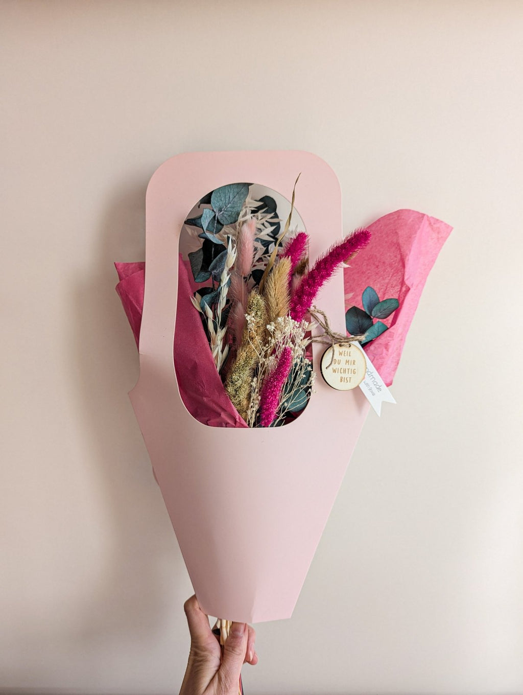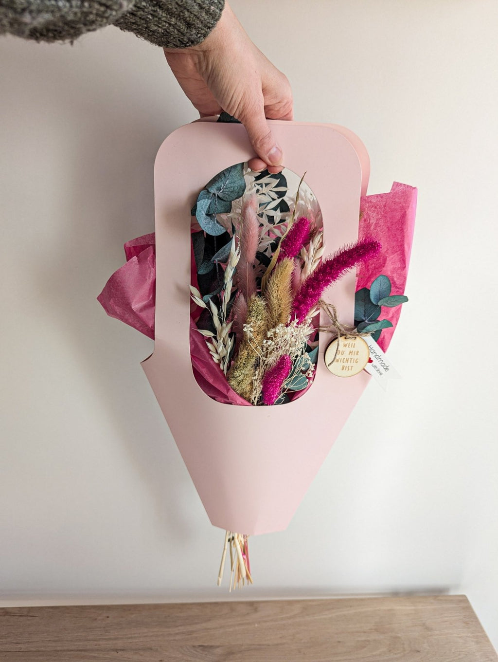 Überrasche deine Liebsten mit einem stilvollen Trockenblumenstrauß in einer bezaubernden rosa Geschenkverpackung in Form einer Tasche aus Kraftpapier. Dieses liebevoll zusammengestellte Arrangement ist das perfekte Mitbringsel zu besonderen Anlässen wie Muttertag, Geburtstag oder Ostern.