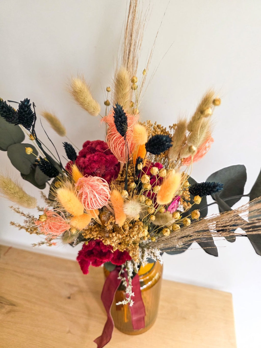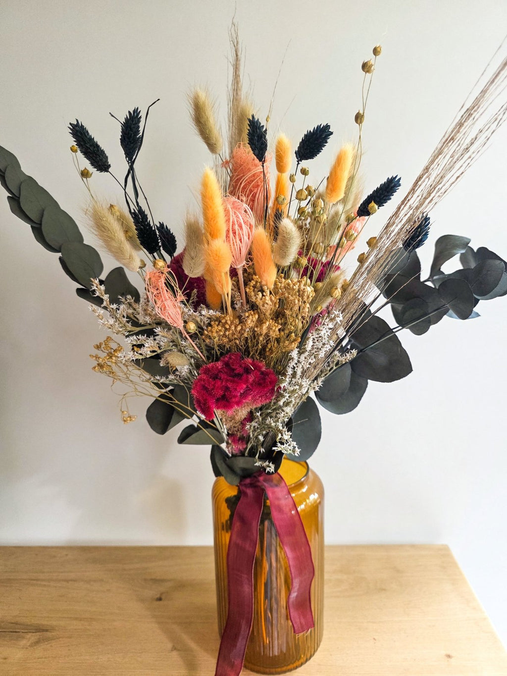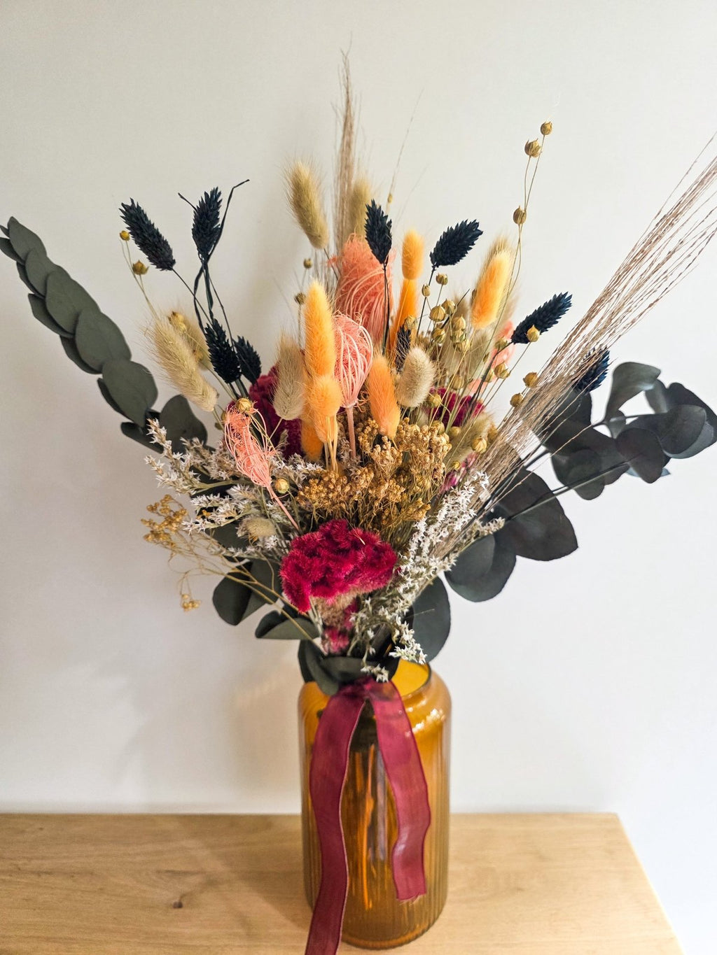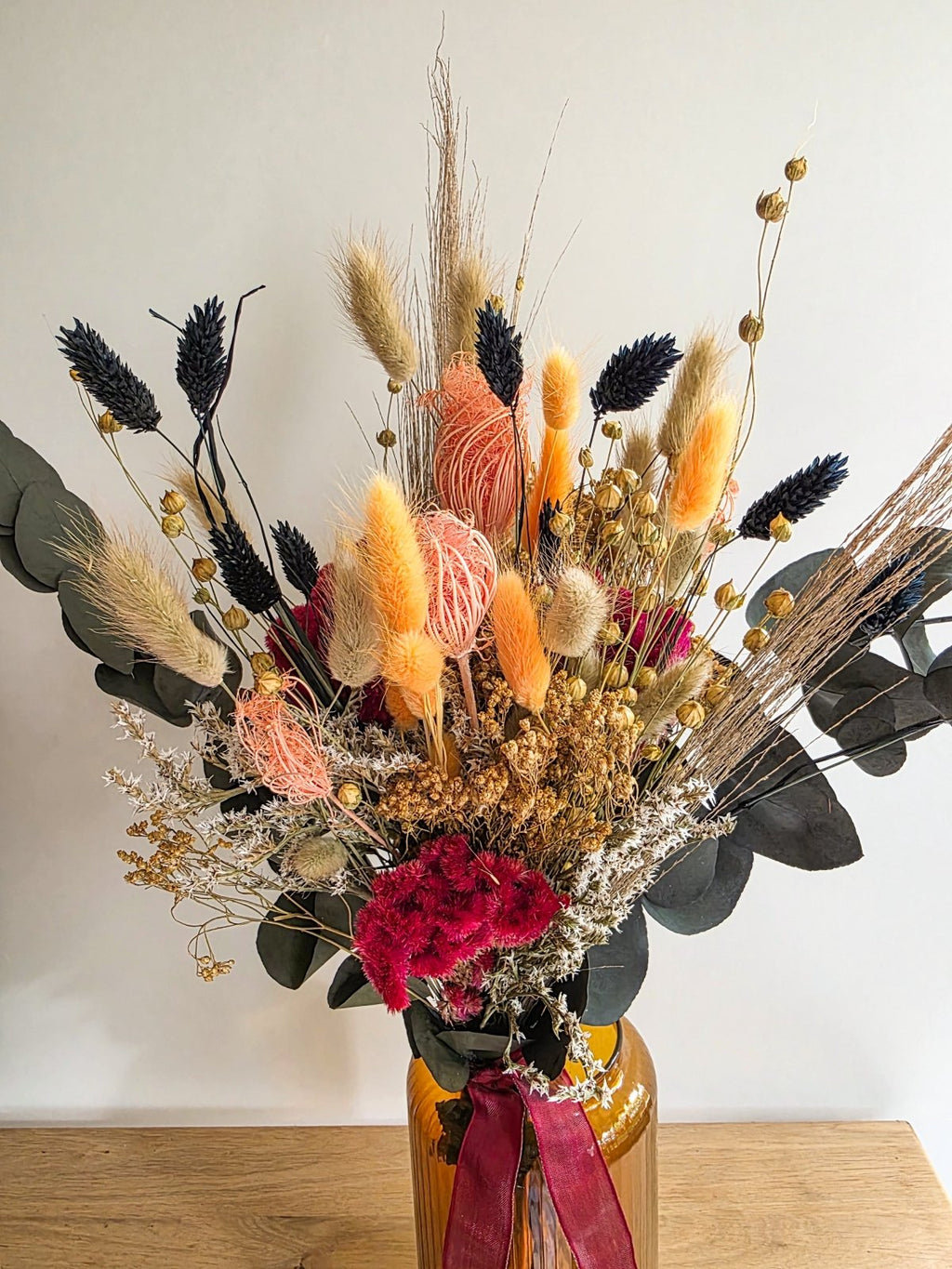 Herbstlicher Trockenblumenstrauß „Autumn Glow“ – Orange | Schwarz | Natur mit pinken Highlights & Eukalyptus
