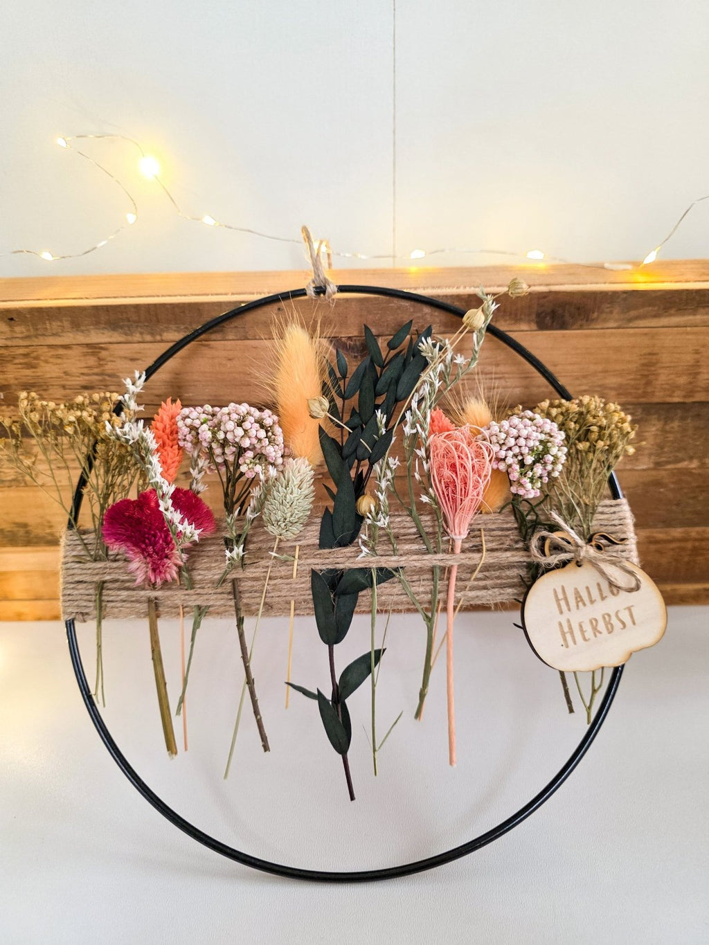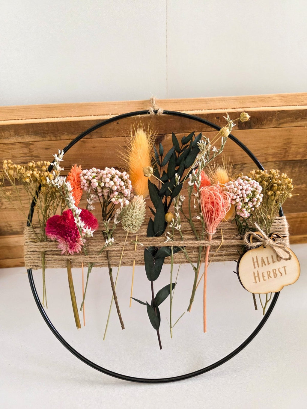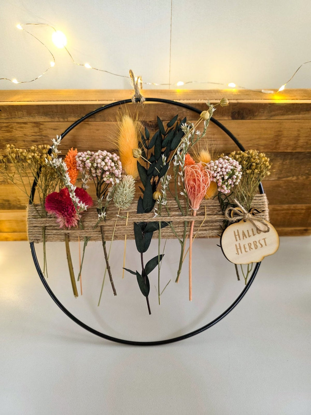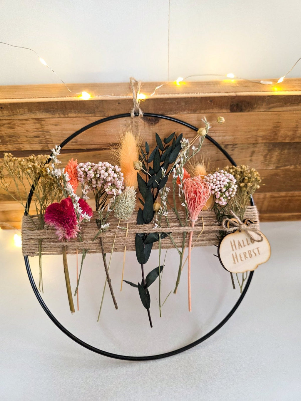 Unser liebevoll von Hand gefertigter Trockenblumenkranz mit schwarzem Metallring vereint natürliche Eleganz und herbstliche Wärme.