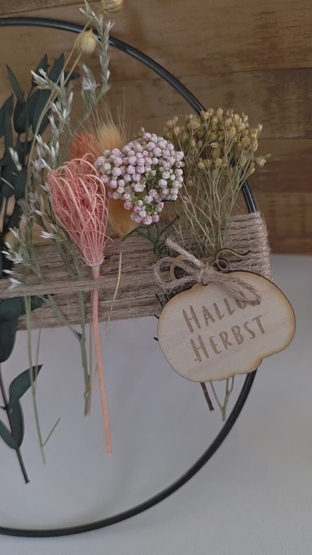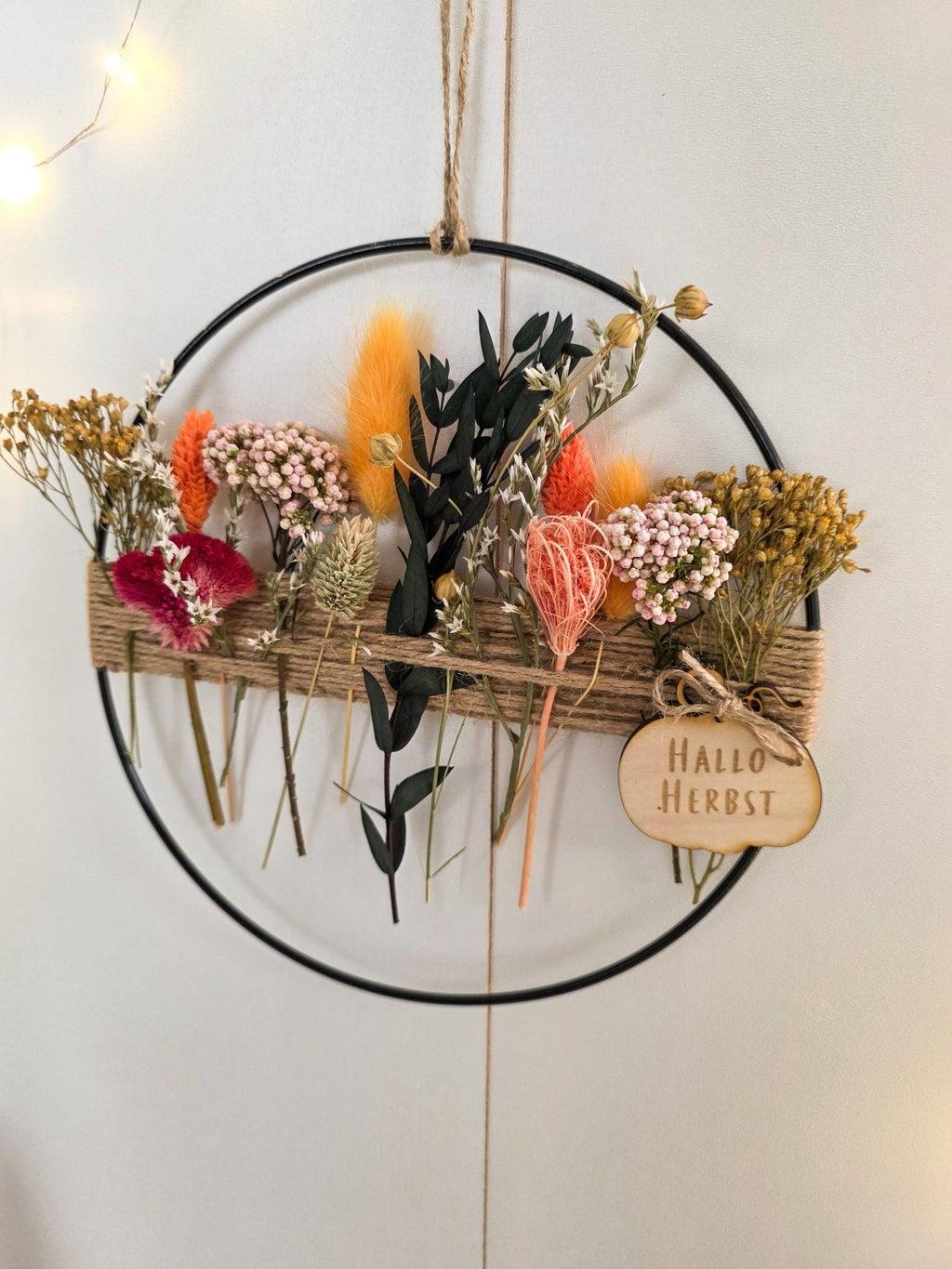 Dekoriert mit Trockenblumen in Natur- und Orangetönen, passt er perfekt zur Herbst- und Kuschelzeit – egal ob an der Tür, der Wand oder im Fenster 🌾